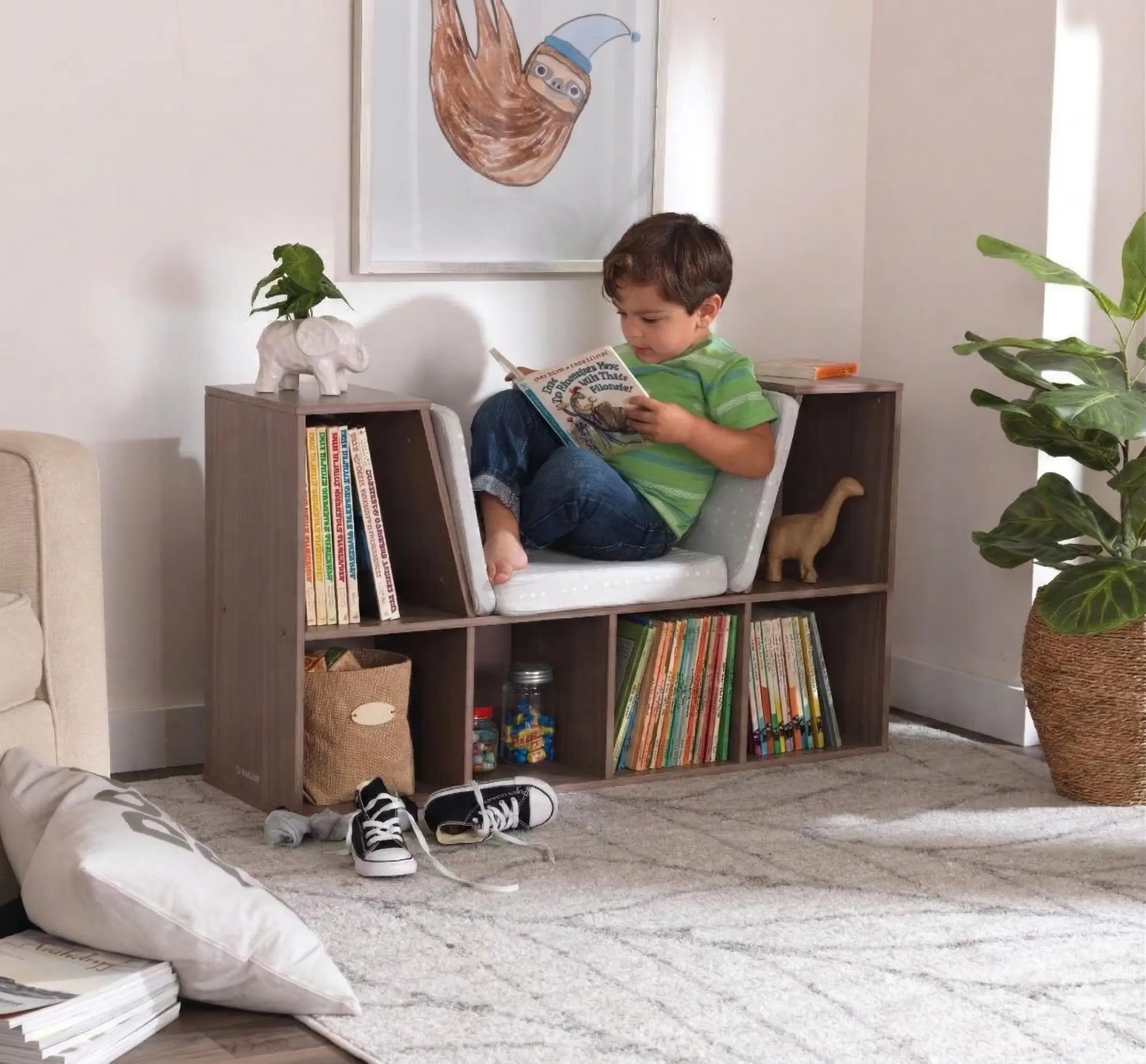 Desde la perspectiva Montessori, este mueble constituye un punto focal de orden. Al estar a ras de suelo, respeta la libertad de movimiento del niño, permitiéndole acceder a sus libros sin ayuda de un adulto. El asiento central acolchado crea una asociación neurológica positiva: el cerebro vincula el aprendizaje con la comodidad y la seguridad (el «nido»), lo que reduce los niveles de cortisol y facilita la entrada en el estado de flujo cognitivo necesario para la comprensión lectora profunda.